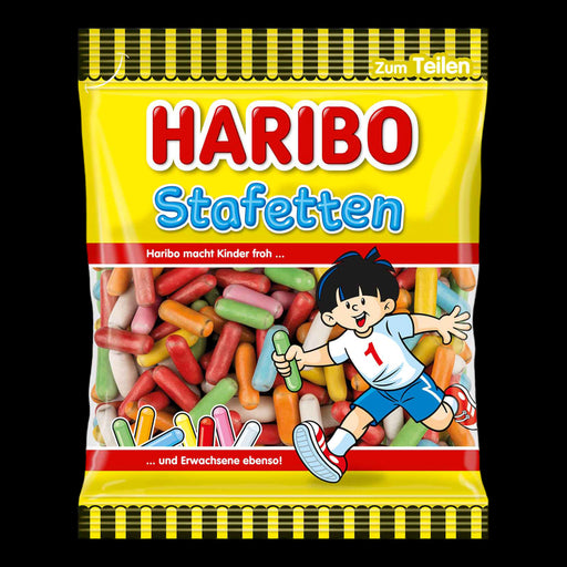 Das sind Haribo Stafetten, die mit einer süß-dragierten Schicht von außen und einem weichen, würzigen Inneren überzeugen. Die ca. 3cm großen, bunt ...