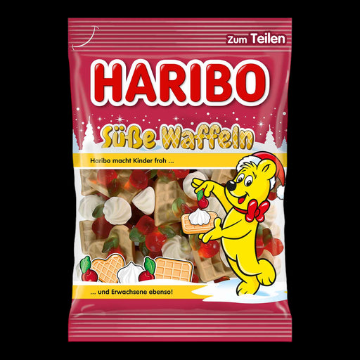 Die Haribo Süßen Waffeln sind endlich da! Hier treffen fluffiger Schaumzucker in Waffel- und Sahneform auf kleine fruchtige Kirschgummis. Der vollm...