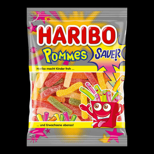 Sauer macht lustig. Haribo Saure Pommes FIZZ sind der bunte Naschspass im Fast-Food-Look. Die ca. 5 cm langen Fruchtgummi-Stäbchen sind sauer gezuc...