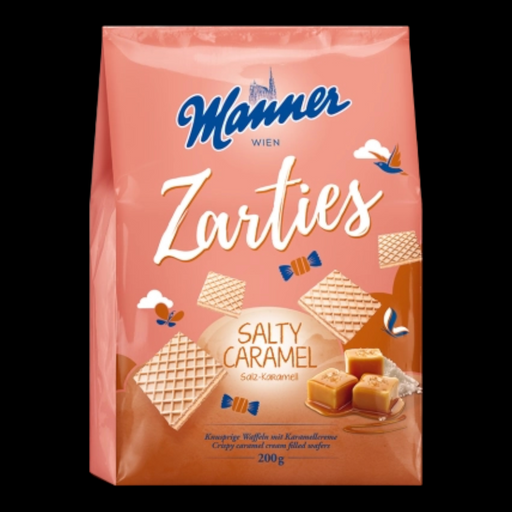 Die leckeren Manner Zarties in der Sorte Salty Caramel verführen alle Naschkatzen, die es gerne knusprig mögen. Zwei zarte Hälften aus einer unverg...