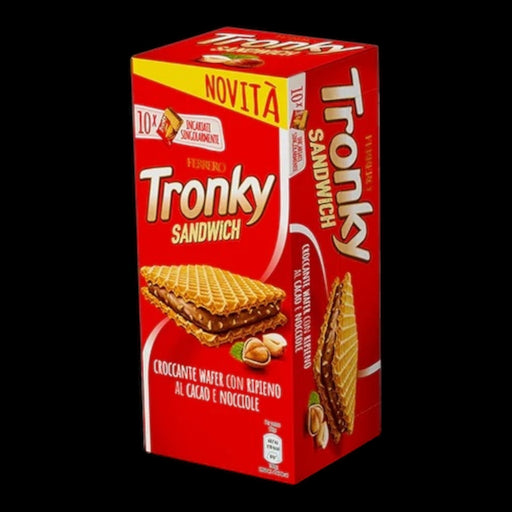 TRONKY SANDWICHZwei Schichten knuspriger, quadratischer Waffeln umhüllen eine köstliche Kakao-Haselnuss-Füllung, zubereitet aus ausgewählten Zutate...