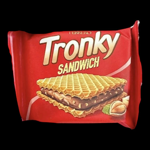 TRONKY SANDWICHZwei Schichten knuspriger, quadratischer Waffeln umhüllen eine köstliche Kakao-Haselnuss-Füllung, zubereitet aus ausgewählten Zutate...